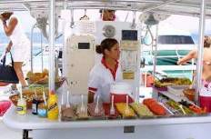 While you are exploring along the beach or the underwater world, your captain and mate are preparing your deluxe Build-your-own sandwich buffet onboard. Following a leisurely lunch your boat will head to a pro-tected area that provides an opportunity for some deeper dive snorkeling for those who wish, others may choose to paddle in the waters off of the bow ladder of the boat, and others may prefer to nap in the shade on board. In the mid-afternoon you will head back to the marina on a down-wind run.